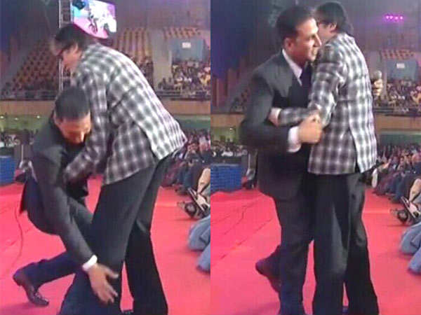 अमिताभ बच्चन को जब अवार्ड लेने के लिए स्टेज पर बुलाया गया तो अक्षय कुमार खुद उन्हें स्टेज से उतरकर लाने पहुंचे। स्टेज से नीचे उतरकर अक्षय कुमार ने अमिताभ बच्चन को पैर छू को प्रणाम भी किया और अमिताभ बच्चन ने उन्हें गले से लगा लिया। ये बहुत ही प्यारा मोमेंट था लेकिन अमिताभ बच्चन शर्मिंदा हो गए। उन्होंने कहा कि अक्षय को ऐसा नहीं करना चाहिए था।