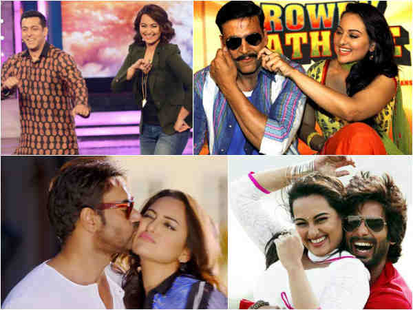 अकेले अक्षय कुमार के साथ सोनाक्षी सिन्हा कई फिल्में कर चुकी हैं जिनमें राउडी राठौड़, हॉलीडे, वन्स अपॉन अ टाइम इन मुंबई दोबारा भी है। अजय देवगन के साथ सोनाक्षी सन ऑफ सरदार में आ चुकी हैं और हिम्मतवाला में उनका स्पेशल अपीयरेंस भी था।