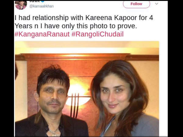लेकिन अब इस चुटकुले को अगले और बेहुदे लेवेल पर लेकर गए केआरके। तो केआरके ने करीना कपूर के साथ एक तस्वीर ट्वीट करते हुए रंगोली को संदेश दिया कि मेरे और करीना की यही एक फोटो है और मैं उसके साथ चार साल तक रिलेशनशिप में था।