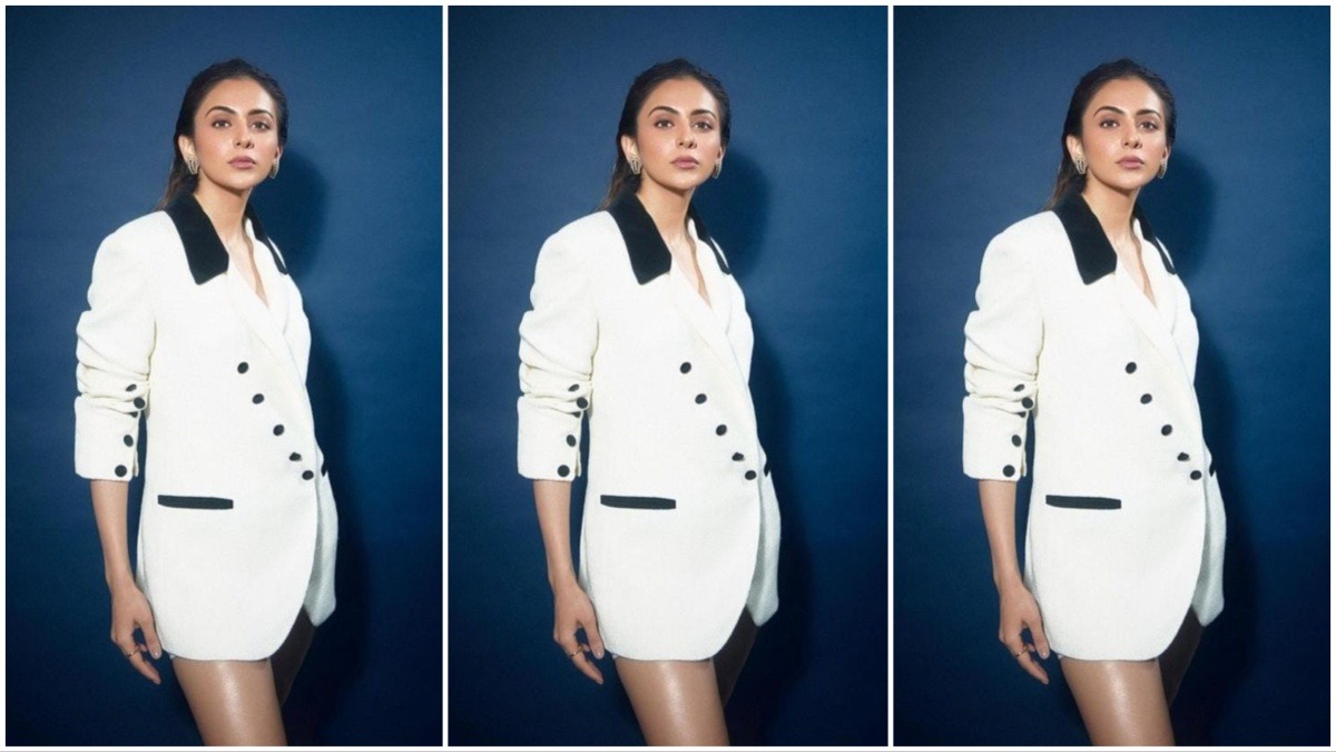 अपने दमदार लुक को पूरा करने के लिए रकुल प्रीत सिंह ने व्हाइट ब्लेजर के साथ कानों में छोटे ईयरिंग्स कैरी किए हैं और बालों को आधा बांधकर खुला छोड़ा है, रकुल ने न्यूड ब्राउनिश मेकअप किया था।