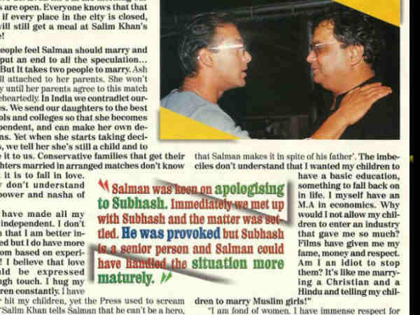 सलमान खान ने इस इंटरव्यू में थप्पड़ मारने की बात का ज़िक्र करते हुए कहा कि आज तक मैंने एक ही आदमी को मारा है और वो सुभाष घई है। ये बात सलमान ने ऐश्वर्या राय के इल्ज़ाम पर कही थी जिसके मुताबिक सलमान ने ऐश्वर्या के साथ मारपीट की थी।