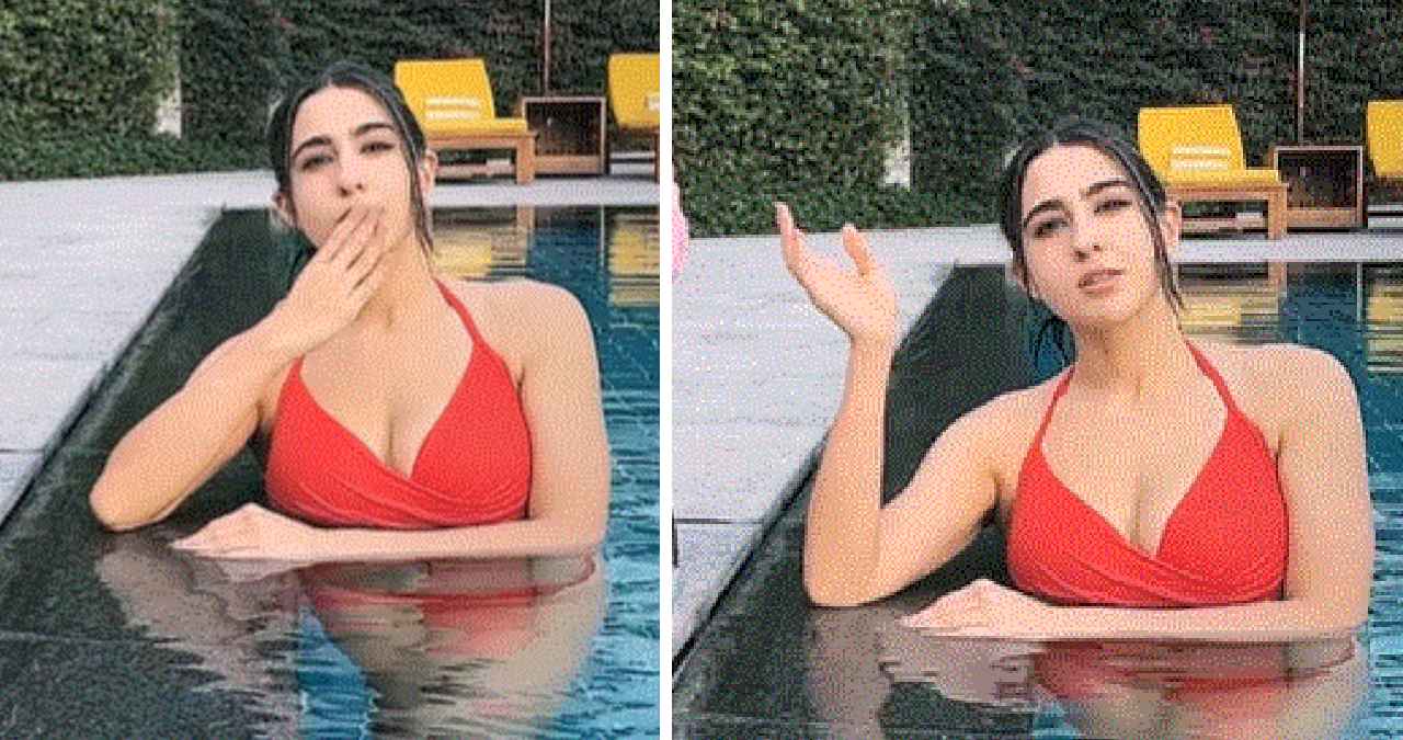 पहले रेड बिकिनी पहनकर पूल में उतरीं सारा अली खान, फिर बगल में बैठे इस शख्स को दे डाली किस!