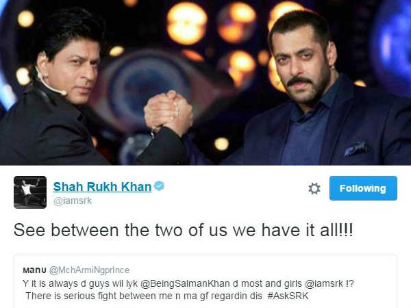 मसलन एक फैन ने उनसे पूछा कि ऐसा क्यों होता है कि लड़कियां सारी आपकी फैन होती हैं और लड़के सलमान के। शाहरूख का जवाब और भी मज़ेदार था - उन्होंने कहा कि बस इसी तरह मिल बांटकर मैं और सलमान ज़िंदगी काट रहे हैं।