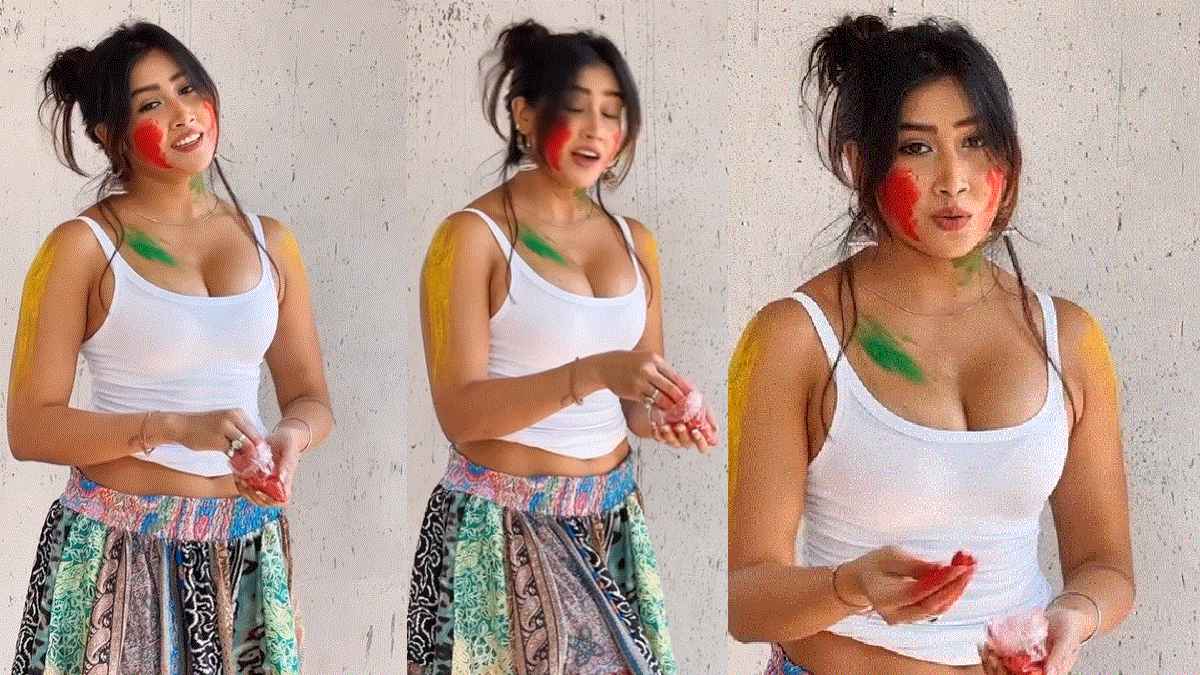 Sofia Ansari Holi- छोटी सी स्कर्ट में होली खेलती दिखीं सोफिया, हॉट लुक देख लोग बोले- हमारे साथ भी..
