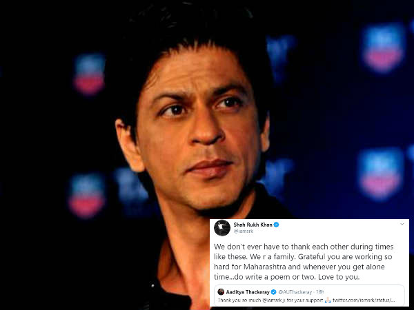 शाहरुख खान ने आदित्य ठाकरे को जवाब देते हुए लिखा है- इस तरह के संकट के वक्त में हमें एक-दूसरे का धन्यवाद करने की जरूरत नहीं है। हम एक परिवार की तरह हैं। मैं आभारी हूं कि आप महाराष्ट्र के लिए बहुत मेहनत कर रहे हैं और जब भी आपको अकेले समय मिलता है ... एक कविता या दो लिखें। आप को ढ़ेर सारा प्यार।