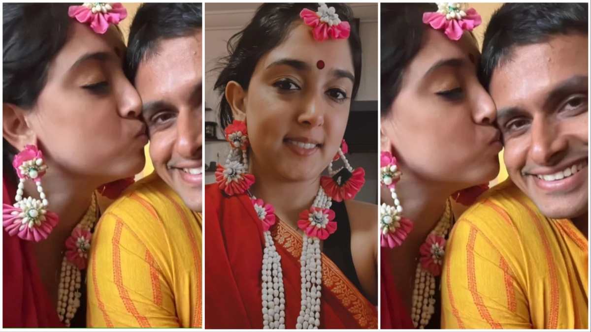 अब एक बार फिर आयरा ने कुछ फोटोज इंस्टाग्राम स्टोरी पर पोस्ट की है। पहली फोटो में वह पिंक कलर की साड़ी पहले माथे पर बिंदी लगाए और नकली फूलों से बनी ज्वेलरी पहने नजर आ रही हैं। दूसरी फोटो में आयरा मंगेतर नुपुर को किस करती नजर आ रही हैं।