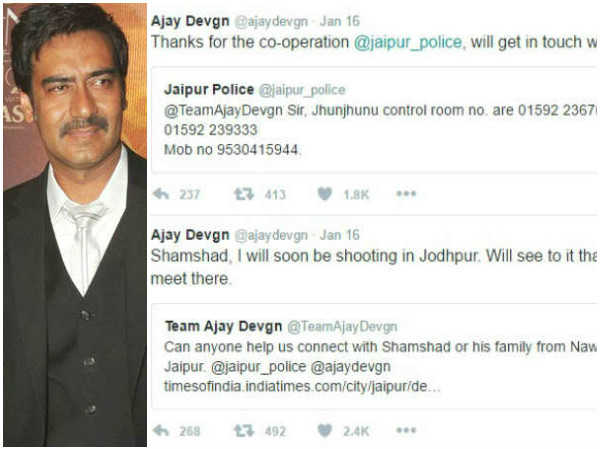 अजय देवगन को जब ये पता चला तो उन्होंने ट्विट किया कि वो जल्द ही शूटिंग के सिलसिले में जोधपुर आएंगे और शमशाद से मिलेंगे और अजय देवगन की टीम ने भी झुंझनू पुलिस से शमशाद का नंबर और डिटेल मांगा।