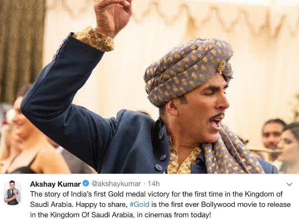 अक्षय कुमार के पास आजकल सोने का जादू है। जिस चीज़ को छू लेते है वो सोना बन ही जाता है। और ताज़ा उन्होंने छुआ, रीमा कागती की फिल्म गोल्ड को। अब अक्षय कुमार की गोल्ड ने अपने सहरे पर एक और पंख लगा लिया है। गोल्ड, सऊदी अरब में रिलीज़ होने वाली पहली बॉलीवुड फिल्म बनने जा रही है और इस बात की जानकारी खुद अक्षय कुमार ने ट्वीट करके दी।