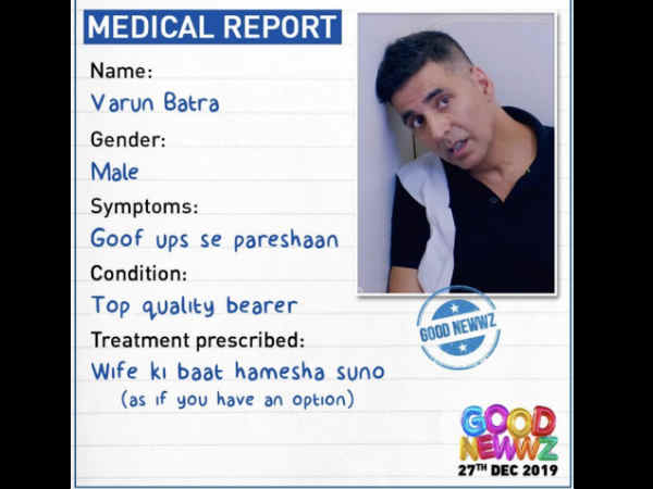 अक्षय कुमार फिल्म में वरूण बत्रा का किरदार निभा रहे हैं। जिनका लक्षण ये है कि वो अपनी ज़िंदगी में बेवकूफियों से परेशान रहते हैं। उनका ट्रीटमेंट एक ही है - अपनी पत्नी की बात हमेशा सुना करो। देखिए उनकी मेडिकल रिपोर्ट।