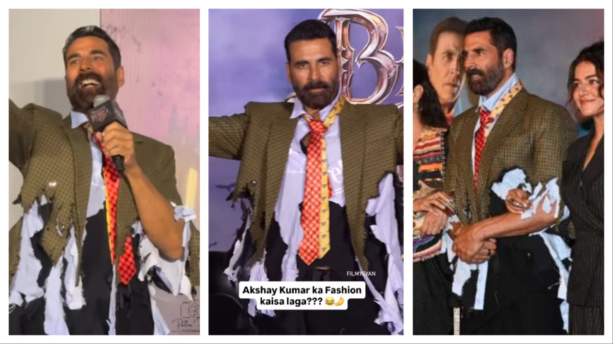 दरअसल, इस दौरान अक्षय कुमार किसी भी इमेजिनेशन से परे हैरान करने वाले फटेहाल लुक में दिखाई दिए। इस दौरान अक्षय कुमार का शर्ट और ब्लेजर ऐसा था जैसे किसी फकिर का फटे चीथड़े जैसा। अक्षय कुमार ने अपने इस लुक को काफी शानदार अंदाज में फ्लॉन्ट किया।