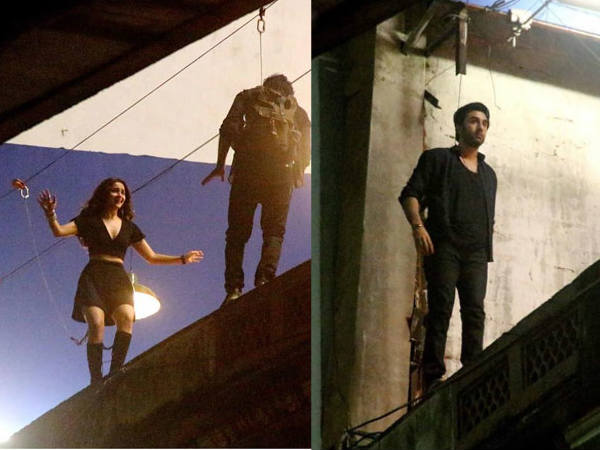 इन तस्वीरों में साफ़ देखा जा सकता है कि रणवीर और आलिया अपने सीन पर काम कर रहे हैं। दोनों सितारे रस्सी से बंधे हुए हैं और एक्शन सीन देने की तैयारी में हैं। आलिया ब्लैक कॉस्ट्यूम में काफी क्यूट दिख रही हैं।