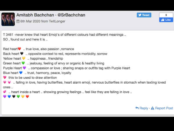 अमिताभ बच्चन ने अपने ट्विटर पर शेयर किया कि वो हैरान हैं कि इन इमोजी में इतने सारे रंग के दिल हैं और हर दिल का एक अलग ही मतलब होता है।