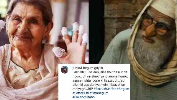 फारूख जफर के निधन पर गुलाबो सिताबो की लेखिका जुही चतुर्वेदी ने भी एक भावुक पोस्ट लिखते हुए उन्हें श्रद्धांजलि दी। फिल्म से फारूख जफर के किरदार बेगम की एक बेहद खास तस्वीर शेयर करतेे हुए जुही ने गुलाबो सिताबो की तीसरी मंज़िल की इस महारानी को याद किया।