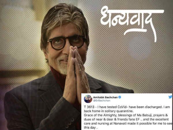 अमिताभ बच्चन ने ट्वीट कर बताया कि उन्हें आज सुबह अस्पताल से छुट्टी मिल चुकी है और अब वो अपने कमरे में ही अगले कुछ दिन क्वारंटीन रहेंगे।