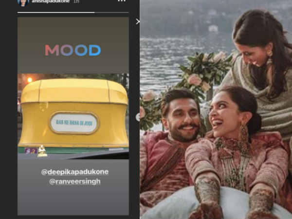 दीपिका पादुकोण की बहन अनीशा पादुकोण भी काफी फिल्मी हैं। कम से कम उन्होंने दीपिका और रणवीर की शादी के दौरान ये बात कई बार साबित कर दी। हाल ही में अनीशा ने अपनी इंस्टाग्राम स्टोरी पर एक तस्वीर शेयर की और उसमें रणवीर और दीपिका को टैग कर दिया। तस्वीर एक ऑटोरिक्शा की थी जिसके पीछे लिखा हुआ था - रब ने बना दी जोड़ी।