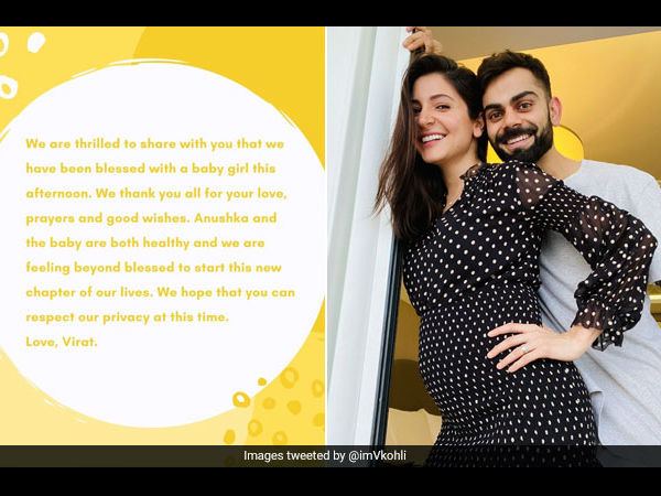 विराट कोहली ने ये जानकारी देते हुए बताया कि हम दोनों को यह बताते हुए बहुत ख़ुशी हो रही है कि आज दोपहर हमारे यहां बेटी हुई है। हम आपके प्यार और मंगलकामनाओं के लिए दिल से आभारी हैं। अनुष्का और हमारी बेटी, दोनों बिल्कुल ठीक हैं और हमारा यह सौभाग्य है कि हमें इस ज़िंदगी का यह चैप्टर अनुभव करने को मिला। हम जानते हैं कि आप यह ज़रूर समझेंगे कि इस समय हम सब को थोड़ी प्राइवसी चाहिए होगी। स्नेह - विराट।