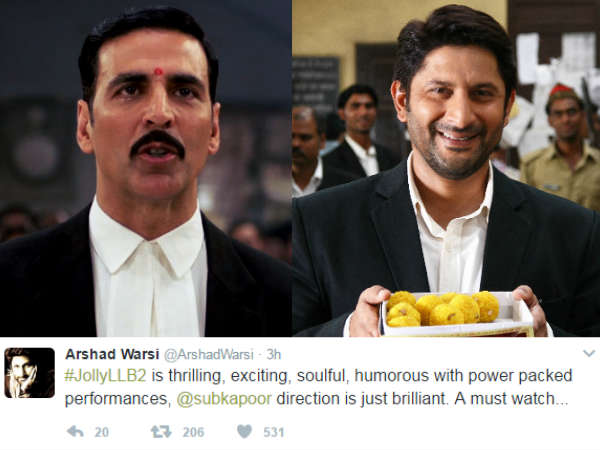 हालांकि लोगों का ऐसा मानना नहीं है। हर किसी की राय में जॉली एलएलबी 2 अपनी पहली फिल्म के लेवेल तक नहीं पहुंच पाई हैं। ऐसे में अरशद वारसी का फिल्म की तारीफ करते जाना कुछ फैन्स को अच्छा नहीं भी लग रहा है।
