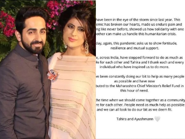 आयुष्मान खुराना और ताहिरा कश्यप ने महाराष्ट्र सीएम राहत कोष में आर्थिक सहायता दी है। उन्होंने सोशल मीडिया पर जानकारी देते हुए बताया और लोगों से भी अपील की कि सब एक दूसरे की मदद करें।