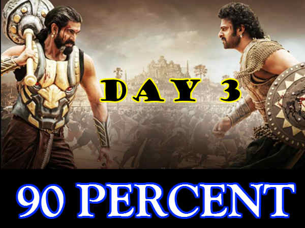 बाहुबली नाम की सुनामी है कि रूकने का नाम ही नहीं ले रही है। और अब माना जा रहा है कि फिल्म ने तीसरे दिन की शुरूआत भी धमाकेदार ढंग से की है। अगर ट्रेड पंडितों की मानें तो तीसरे दिन बाहुबली ने 90 प्रतिशत Occupancy के साथ ओपनिंग की है।
