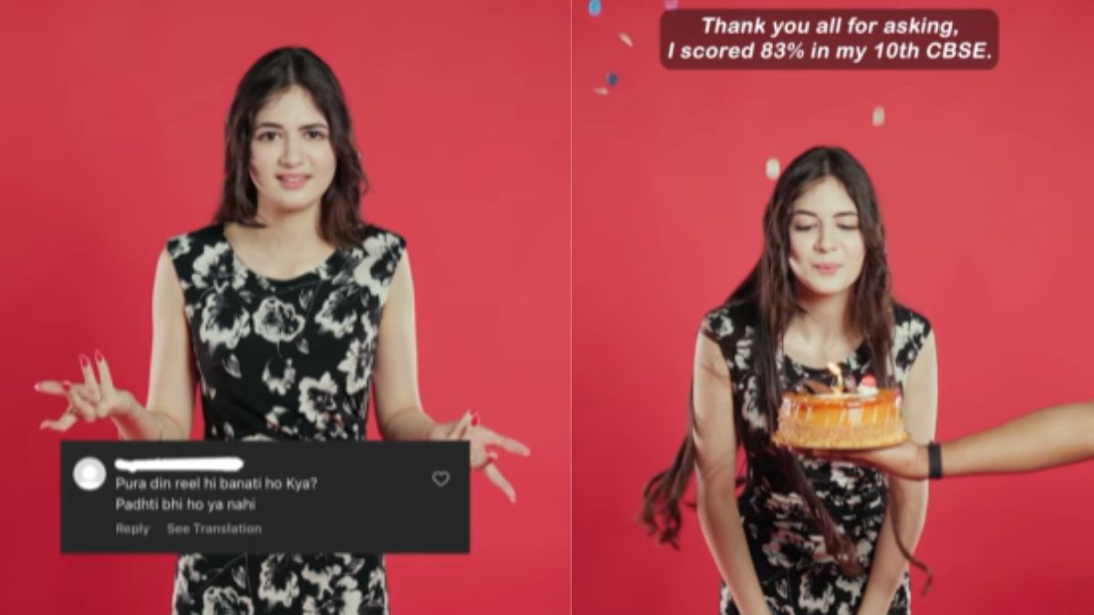 10 का रिजल्ट निकलते ही हर्षाली मल्होत्रा ने अपने सोशल मीडिया एक वीडियो शेयर किया। इस वीडियो में हर्षाली पहले तो ट्रोलर्स के कमेंट दिखाती नजर आती हैं। एक ने लिखा कभी स्कूल भी जाती हो या नहीं। तो वहीं दूसरे ने लिखा बस डांस करती रहना ऐसे 10वीं पास नहीं होगी। इन कमेंट्स को दिखने के बाद हर्षाली मल्होत्रा केक काटती नजर आती हैं और खुशी से लोगों को बताती हैं कि उन्होंने 83% से 10वीं पास की है। इस वीडियो के शेयर करने के साथ ही वह एक लंबा नोट भी लिखती हैं।