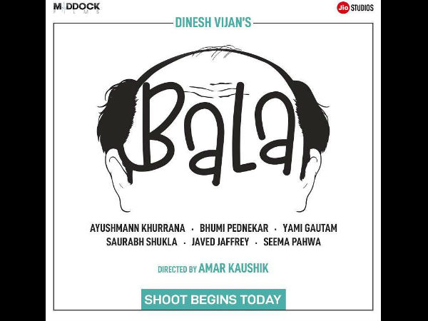 अभिनेता आयुष्मान खुराना की अगली फिल्म बाला की शूटिंग आज से शुरु हो चुकी है और इस फिल्म में उनके किरदार का भी ऐलान हुआ है। बता दें कि इस फिल्म में आयुष्मान खुराना एक गंजे आदमी के किरदार में नजर आने वाले हैं। उनके साथ इस फिल्म भूमि पेडनेकर नजर आने वाली हैं जो कि उनकी पक्की दोस्त भी है। इसके अलावा इस फिल्म यामी गौतम भी नजर आने वाली है और इस फिल्म को अमर कौशिक निर्देशित करने वाले हैं।