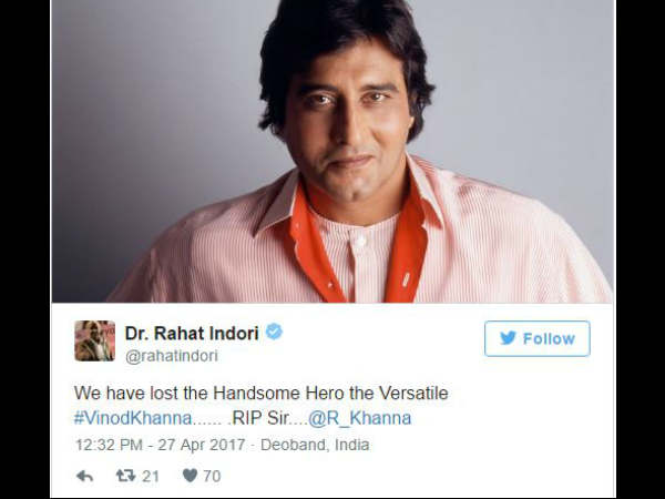 जैसे ही विनोद खन्ना के देहांत की खबर आई ट्टिटर पर उनके चाहने वालों ने उन्हें श्रद्धांजलि दी। कई सितारों ने लिखा है कि वो उन्हें बहुत याद आएंगे। देखें किस किस सेलेब्रिटी ने क्या क्या ट्वीट कर के विनोद खन्ना के जाने पर दुख जताया है..