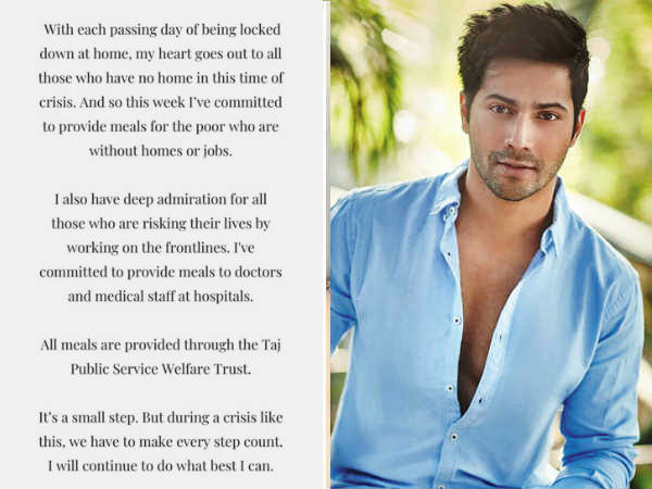 इस कोरोना संकट से निपटने में बॉलीवुड सितारे बढ़ चढ़कर अपना योगदान दे रहे हैं। शाहरुख खान, सलमान खान, अमिताभ बच्चन, प्रियंका चोपड़ा, आमिर खान से लेकर सभी सितारों ने सोशल मीडिया पर योगदान की जानकारी दी है। कुछ ही दिनों पहले वरुण धवन ने प्रधानमंत्री मोदी रिलीफ फंड में 30 और महाराष्ट्र सीएम रिलीफ फंड में 25 लाख रुपये की मदद दी है। वहीं, अब उन्होंने घोषणा की है कि टाटा ट्रस्ट के साथ मिलकर वो गरीबों के साथ साथ कोरोना वायरस से लड़ रहे डॉक्टरों और मेडिकल स्टॉफ को भी खाना उपलब्ध कराएंगे।