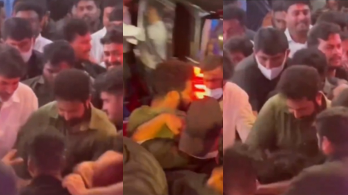 अपने आस-पास कई गार्डों के बावजूद, जूनियर एनटीआर को हिलने-डुलने के लिए मशक्कत करते देखा गया और एक्टर के शांत रहने पर फैंस ने उन्हें घेर लिया, घसीटा और पंजे मारे। एक फैन को तो उनके पैरों पर गिरते हुए भी देखा गया, जिसके कारण आरआरआर स्टार ने अपना संतुलन खो दिया और लगभग फिसल गए।