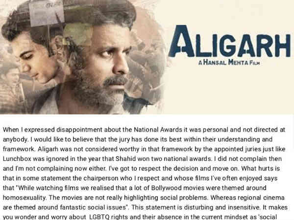 बस इसी बात से क्षुब्ध होकर अलीगढ़ के डायरेक्टर हंसल मेहता ने साफ किया कि उन्हें किसी भी फिल्म से कोई दिक्कत नहीं है। लेकिन समलैंगिकों के अधिकार को इस तरह नकार देना, उससे काफी दिक्कत है।