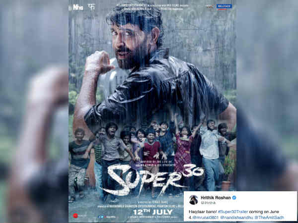 ऋतिक रोशन की सुपर 30 की रिलीज़ डेट तय होने हो चुकी है। फिल्म 12 जुलाई को रिलीज़ हो रही है। अब ऋतिक रोशन ने फिल्म से अपना एक नया पोस्टर रिलीज़ करते हुए फैन्स को बताया है कि फिल्म का ट्रेलर, 4 जून को रिलीज़ हो रहा है। यानि कि सलमान खान की ईद से पहले ही ऋतिक रोशन का सुपर 30 धमाका हो चुका होगा।