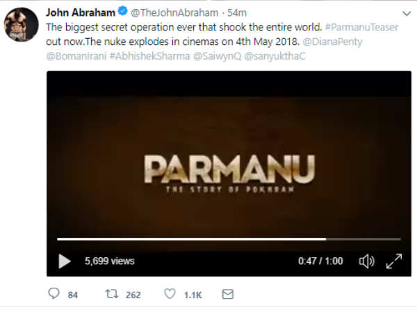 हालांकि परमाणु का टीज़र डालते ही उसे यूट्यूब से हटा दिया गया और फिल्म की प्रोड्यूसर प्रेरणा अरोड़ा ने इस पर कॉपीराइट केस लगा दिया। लेकिन अब जॉन ने टीज़र सीधा अपने ट्विटर अकाउंट पर डाला है।