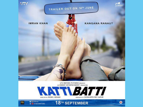 कट्टी बट्टी का पहला पोस्टर रिलीज़ हो चुका है और फिल्म इस पोस्टर की नज़र से काफी कुछ कह रही है। पोस्टर में केवल कंगना रनौत और इमरान खान के पैर दिख रहे हैं। ज़ाहिर सी बात है पैडिक्योर वाले। और दोनों किसी गाड़ी पर बैठे हैं।