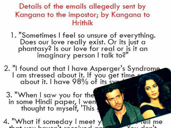 लेकिन अब कंगना रनौत की ऋतिक रोशन को लिखे गए सारे ईमेल इंटरनेट पर लीक हो चुके हैं। ये ईमेल कंगना ने उसी बहरूपिए को लिखे हैं जो खुद को ऋतिक रोशन बताकर उनसे बात कर रहा था। लेकिन कंगना का कहना है कि ये जाली ईमेल आई डी ऋतिक की ही है जो उनसे बात कर रहे थे।