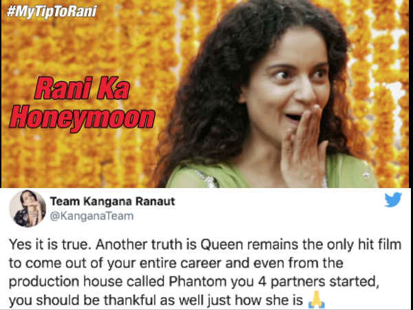 अब कंगना रनौत की टीम ने जवाब देते हुए कहा है कि हां ये बात सच है। लेकिन एक और सच ये है कि क्वीन, अनुराग कश्यप के करियर की इकलौती हिट फिल्म है। उनके प्रोडक्शन हाउस फैंटम से निकली हुई इकलौती हिट फिल्म जिसे चार लोगों ने मिलकर प्रोड्यूस किया था। आपको कंगना का शुक्र मनाना चाहिए जैसे कि वो आपकी शुक्रगुज़ार हैं।