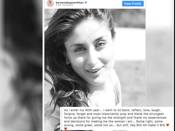 इससे पहले, करीना कपूर ने इंस्टाग्राम पर अपनी एक खूबसूरत तस्वीर के साथ एक पोस्ट शेयर किया। करीना ने अपने इंस्टाग्राम पोस्ट पर लिखा - आज मैं 40 साल की दहलीज़ पर कदम रख रही हूं और मैं बैठ कर कई चीज़ों के बारे में सोचना चाहती हूं।