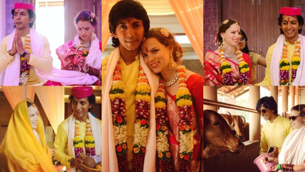 अंशुमन झा और सिएरा विंटर्स की दूसरी शादी मुंबई के 'श्री राधा वृंदावनबिहारी' मंदिर में हुई। मिथिला शादी के लिए अंशुमन ने सफेद पैंट एक मैचिंग दोशाला और एक गुलाबी टोपी के साथ पीले रंग का कुर्ता चुना था। दूसरी ओर, कुंदन ज्वेलरी के साथ लाल बनारसी साड़ी में उनकी पत्नी बेहद खूबसूरत लग रही थीं। उन्होंने अपने लुक को गजरे से सजे हुए मेसी बन हेयरडू के साथ पेयर किया था और प्योर ब्राइडल ग्लो बिखेरा था।