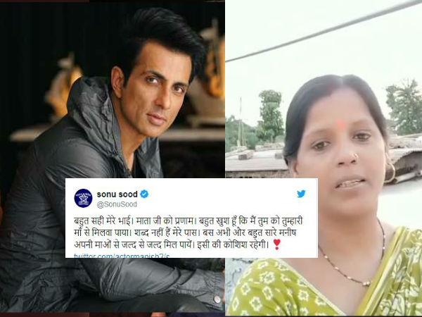 अभिनेता सोनू सूद की वजह से एक मां अपने बेटे को लॉकडाउन की मुश्किल घड़ी में देख पाई। प्रवासी मजदूर जो अपनी मां से कोसों दूर फंसा था, उसकी मदद सोनू सूद ने की। मनीष नाम के इस शख्स ने एक वीडियो ट्विटर पर पोस्ट किया है। जिसमें उसने अपनी मां का संदेश एक्टर के लिए रिकॉर्ड किया है। मां खुद को रोक नहीं पाती और वीडियो में रो पड़ती है, वह रोते रोते पूरा वीडियो रिकॉर्ड करती हैं और सोनू सूद का धन्यवाद करते करते नहीं थकती।