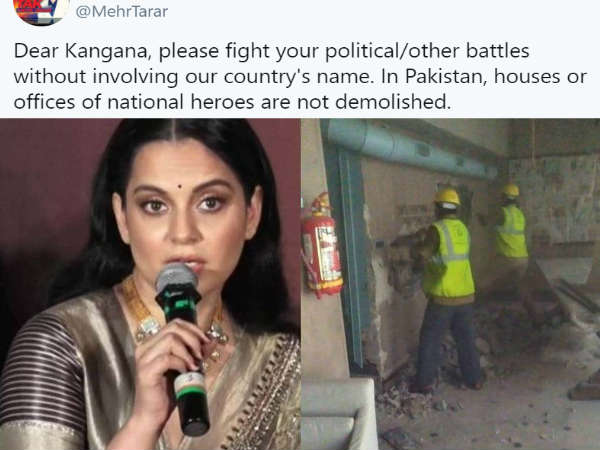 कंगना रनौत ने एक बार फिर से मुंबई की तुलना कल पाकिस्तान से कर डाली। दरअसल बीएमसी का बुल्डोजर चलते ही उन्होने इसकी तस्वीर साझा करते हुए कैप्शन में 'पाकिस्तान' लिखा था। लेकिन अब पाकिस्तान से इस बात का विरोध हुआ है कि हमारा नाम इसपर क्यों लिया जा रहा है। एक पाकिस्तानी पत्रकार को ये बात इतनी नागवार गुजरी है कि उसने कंगना रनौत को एक ट्वीट करते हुए जवाब दिया है।