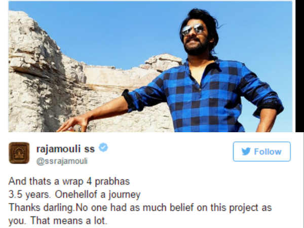 फिल्म की शूटिंग खत्म होने पर राजामौली ने प्रभास की एक तस्वीर डालते हुए लिखा कि प्रभास ने 3.5 साल का सफर पूरा किया। और इस फिल्म पर अपना भरोसा रखने के लिए शुक्रिया। वाकई आपकी जितनी तारीफ की जाए कम है।