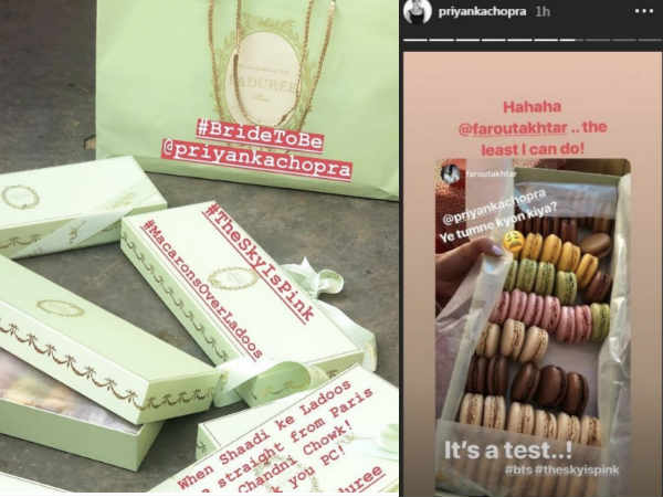 और ये गिफ्ट थे प्रियंका की शादी का लड्डू यानि कि जिसे हम और आप आम बोलचाल की भाषा में बैना कहते हैं। एकदम हल्के पेस्टल शेड का ये बॉक्स सेट पर हर व्यक्ति के पास आया है और प्रियंका चोपड़ा ने शादी के लड्डुओं को फ्रेंच मैकरून से बदल दिया है। इसकी तस्वीरें बेहद दिलचस्प थीं। वहीं प्रियंका ने इन मैकरून का आधा खाली डिब्बा भी अपने सोशल मीडिया पर शेयर किया जिस पर फरहान अख्तर ने अपनी प्रतिक्रिया भी दी।