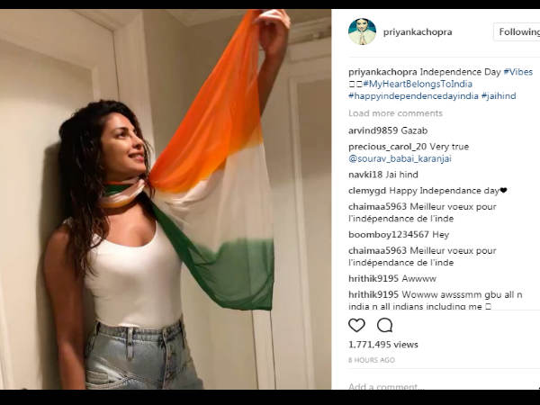 प्रियंका चोपड़ा पिछले कुछ सालों से हॉलीवुड में भारत का नाम ऊंचा कर रही हैं और सफलता की नई इबारत लिख रही हैं। फिलहाल प्रियंका चोपड़ा के पास दो हॉलीवुड फिल्में हैं। स्वतंत्रता दिवस के मौके पर हर कोई एक दूसरे को बधाई दे रहा था और प्रियंका चोपड़ा ने भी अपने फैन्स को बधाई दी। उन्होंने गले में एक दुपट्टा पहना जो तिरंगे के रंग का था।