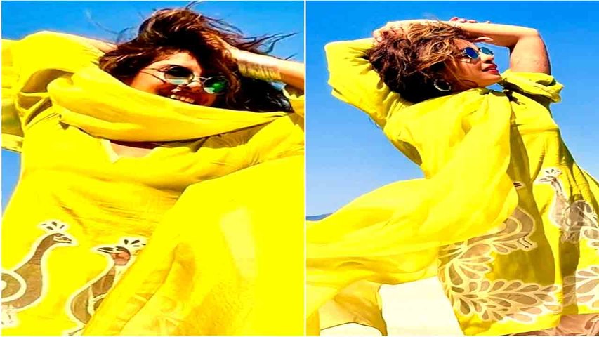 प्रियंका चोपड़ा कुछ पूल टाइम एन्जॉय कर रही हैं और उन्होंने पीले रंग की बिकिनी पहनी हुई है। पहली फोटो में प्रियंका कैमरे के लिए पोज दे रही हैं और दूसरी फोटो में वह फनी एक्सप्रेशन दे रही हैं और हंस रही हैं।