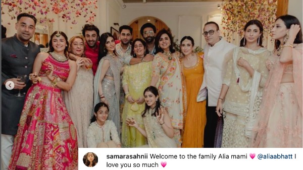 तस्वीर शेयर करते हुए समारा ने लिखा - परिवार में आपका स्वागत है आलिया मामी। मैं आपसे बहुत प्यार करती हूं। गौरतलब है कि समारा का इंस्टाग्राम अकाउंट उनकी मां रिद्धिमा कपूर साहनी हैंडल करती हैं। समारा को लगभग 40 हज़ार लोग फॉलो करते हैं।