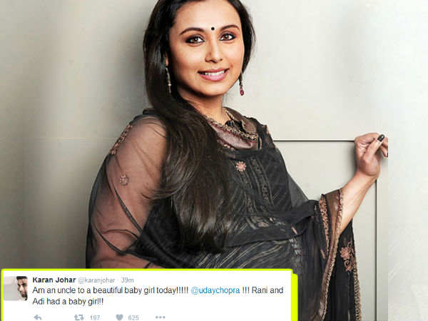 [बॉलीवुड समाचार] रानी मुखर्जी ने एक प्यारी सी बेटी को जन्म दिया है और बॉलीवुड उन पर बधाइयां बरसा रहा है। बेटी का नाम रानी मुखर्जी और आदित्य चोपड़ा के नाम को मिलाकर रखा गया है - अदीरा। इस बात की जानकारी सबको ट्विटर से मिली।