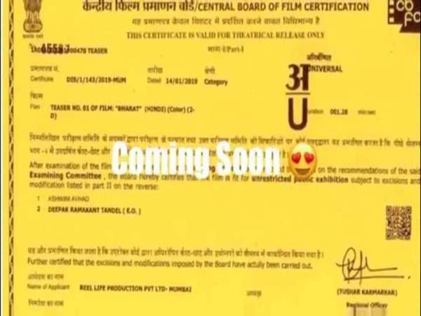 हालांकि इस वीडियो में किसी को ज़्यादा कुछ समझ नहीं आ रहा है। बस भारत के टीज़र का सेंसर स्रर्टिफिकेट है और पीछे बेतहाशा ढोल नगाड़ों की आवाज़ है। अगर वीडियो में कुछ दिख रहा है तो वो है तिरंगा झंडा। लेकिन 20 सेकंड की इस झलक के बाद फैन्स, फिल्म के टीज़र के लिए उतावले हो चुके हैं।