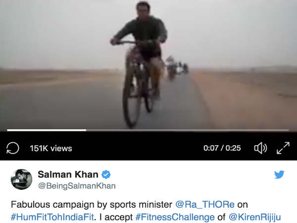 इसके बाद लोग एक दूसरे को नॉमिनेट करने लगे थे और फिर मंत्री किरण रिजिजू ने सलमान खान को नॉमिनेट किया था। अब सलमान खान ने हम फिट तो इंडिया फिट चैलेंज कुबूल कर अपना फिटनेस वीडियो डाला है।