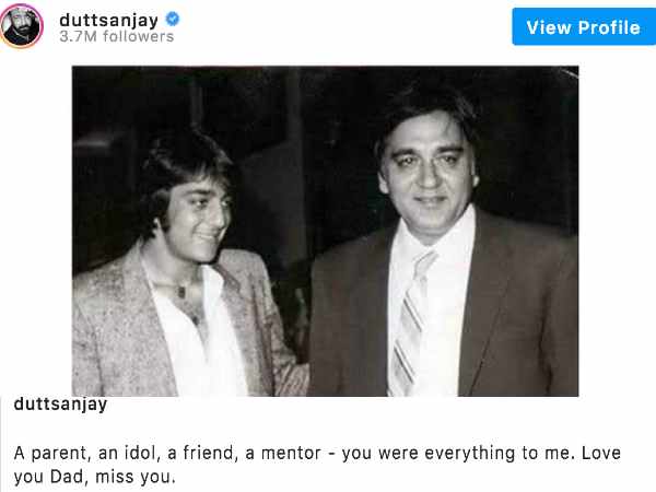 संजय दत्त ने पिता के साथ एक तस्वीर डालते हुए लिखा - एक पिता, एक आदर्श, एक दोस्त, एक मेंटॉर, आप मेरे सब कुछ थे। आपको ढेर सारा प्यार डैड। आपकी कमी खलती है।