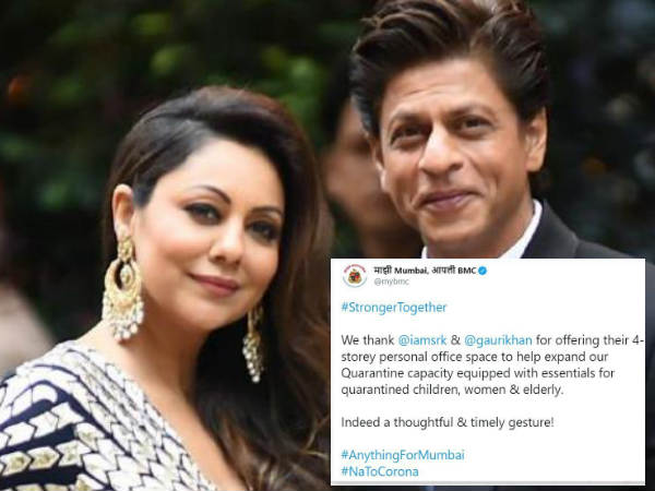 बता दें, खुद बीएमसी ने भी शाहरुख और गौरी को इस मदद के लिए धन्यवाद किया है। उन्होंने ट्विट करते हुए लिखा- हम शाहरुख खान और गौरी खान का शुक्रिया अदा करते हैं कि उन्होंने अपना 4 मंजिला पर्सनल ऑफिस हमें दिया ताकि हम अपनी क्वारंटाइन सुविधा को बढ़ा सकें। यहां क्वारंटाइन किये गए बच्चों, महिलाओं और बूढों के लिए जरूरत के सभी सामान होंगे। बेशक एक विचारशील कदम!"