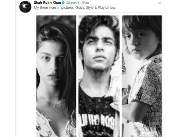 शाहरुख खान ने अपने बच्चों की एक कोलाज शेयर की है और उन्हें अपना Vices बताया है। शाहरुख खान ने इस तस्वीर में सुहाना खान को ग्रेसफुल, आर्यन को स्टाइलिश और अबराम को प्लेफुल बताया है। उनके इस ट्वीट को लोग काफी ज्यादा लाइक कर रहे हैं।