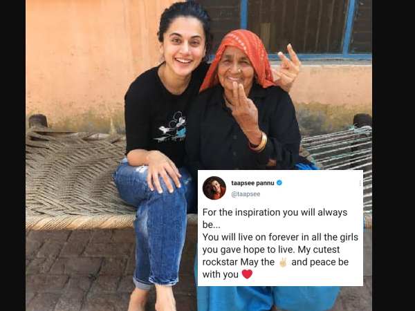 वहीं, तापसी ने दादी चंद्रो तोमर के साथ फोटो शेयर करके लिखा- "आप हमेशा एक प्रेरणा रहेंगी। जिन लड़कियों को आपने जीने की आस दी है, उनमें आप हमेशा ज़िंदा रहेंगी। मेरी सबसे क्यूट रॉकस्टार ईश्वर आपको शांति दे।"